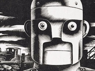 Burns paid no attention to the Brigadier, and a few seconds later he joined Burns in the large chamber. He was again surprised at what he saw. The chamber was forty feet high. It had been made this big to house something that was thirty feet tall. Burns looked up at the mighty creation. He looked up at a huge red metallic face with huge glass-like eyes. The head was connected to a huge body with massive arms and legs.